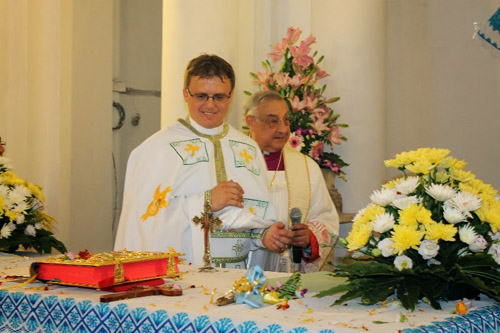 Дзвони української церкви зустрічали процесію. Владика Діонісій розрізав синьо-блакитні стрічки, після чого увійшовши першим, благословив свяченою водою відновлену церковцю. Відтак було зачитано Декрет про призначення першого пароха та розпочато обряд його введення.