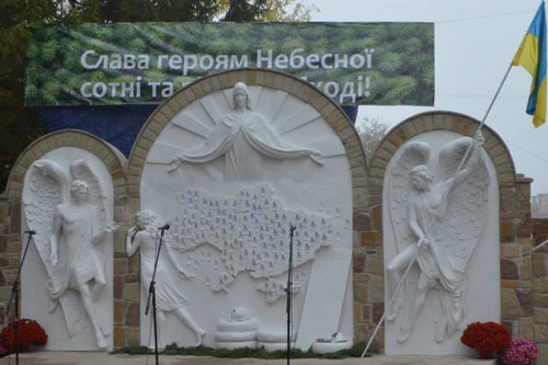 «Основний задум – зобразити героїв «Небесної сотні» у силуетах, – наголосив скульптор. – Вони наче вирвані з серця України. Збоку зображені ангели-охоронці. Один спустився, щоб втішити тих, що плачуть досі, інший зі стягом – підтримує Україну. Також ми зобразили дівчину, вона – символ матерів, коханих, які досі сумують за найдорожчими». У центрі стели Богородиця, яка своїми покровом огортає Україну, тут також атрибути Майдану: шини, щит, каски.