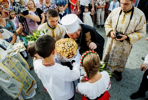 Перед святинею у барвистих вишиванках хлібом-сіллю діти вітали Митрополита Василія, котрий у притаманній йому манері щиро дякував, благословив та спілкувався з найменшими парафіянами і всіма присутніми. Відтак відбувся чин освячення церкви та Архиєрейська Божественна Літургія, в якій Митрополиту співслужили священики тернопільських парафій.