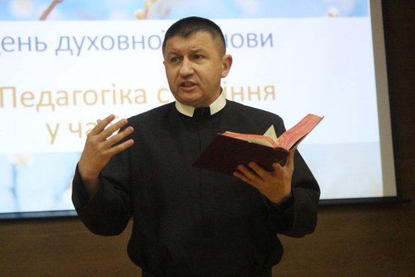 На прикладі життя Ісуса Христа отець-спікер наводив, як вчителю  повинен вміти опановувати себе та свої емоції, не піддаватися різноманітним чинникам, які підточують педагога і наражають на помилки: «Зараз ми з вами у часі Великого Посту маємо чудову нагоду перевірити свою витримку, можливість побачити, чого не вистачає нам ,щоб підтримувати свою душу: суть посту – не їсти один одного.»