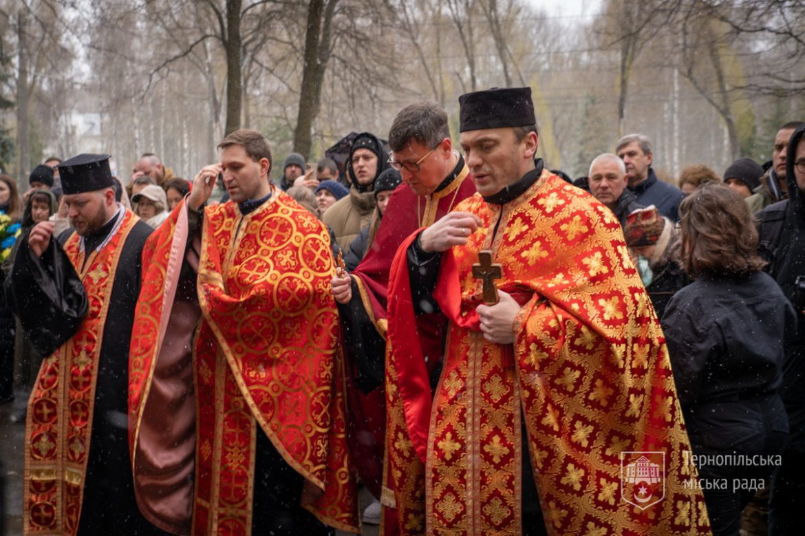 Чин Панахиди за упокій загиблих воїнів і освячення меморіальної дошки провели священики УГКЦ: настоятель храму Покрови Пресвятої Богородиці о. Олег Харишин, настоятель храму Пресвятої Трійці о. Роман Дутчак, о. Роман Підгайний (сотрудник храму Святого Духа) та о. Тарас Хома (сотрудник храму Положення Чесної Ризи Пресвятої Богородиці). Отець Олег Харишин висловив вдячність і пошану полеглим героям за їхній подвиг та закликав присутніх наслідувати їхню любов до Батьківщини.