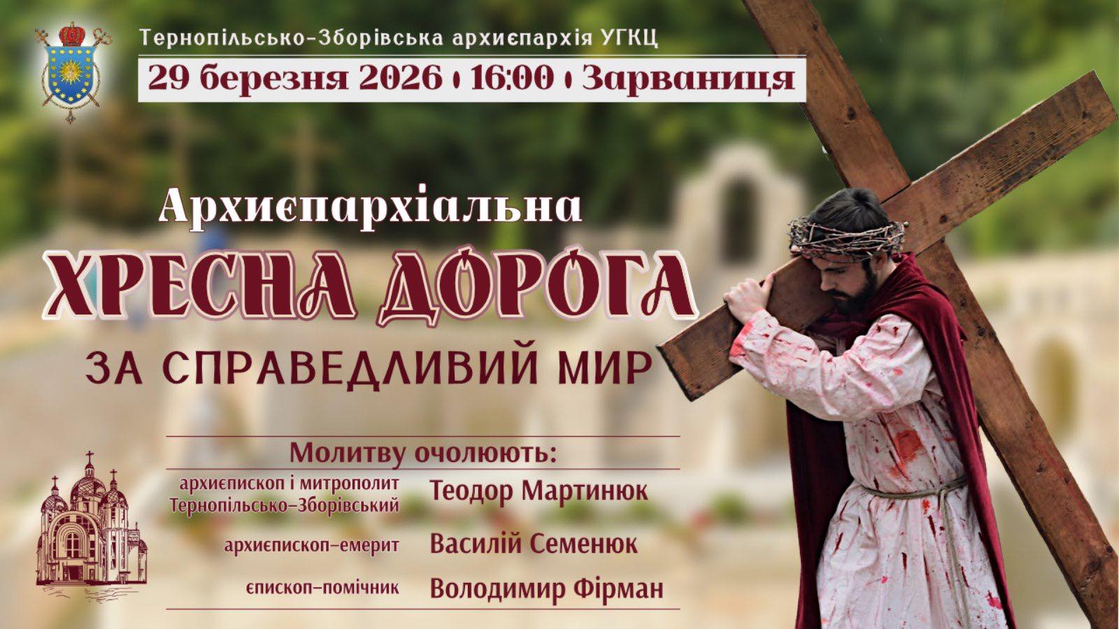 Архиєпархіальна Хресна дорога у Зарваниці by press 20.03.2026 20.03.2026 2 A+A- Reset 2 Вам сподобалася ця стаття?Так0Ні0 Поділитися 0 FacebookTwitterWhatsappTelegramSkypeViberThreadsBluesky Вам також може сподобатися ГРАФІК ПРОЩ У МАРІЙСЬКОМУ ДУХОВНОМУ ЦЕНТРІ «ЗАРВАНИЦЯ» 2026... 10.02.2026 Школа Християнського Аніматора – стартує реєстрація! 27.11.2025 Вечір спогадів про владику Михаїла Сабригу 19.11.2025 Запрошуємо на виставку творчих робіт владики Михаїла Сабриги 18.11.2025 Запрошуємо на показ документального фільму «Владика Михаїл Сабрига:... 17.11.2025 У Тернополі відкриють Центр душпастирства родин полеглих у... 14.10.2025 Проща до Зарваниці монашества і молоді 07.10.2025 Успенська проща до Зарваниці 09.08.2025 Відпуст до Чудотворної Ікони Божої Матері в Буцневі 15.06.2025